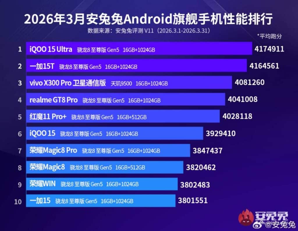 Le smartphone le plus puissant du moment selon AnTuTu est l’iQOO 15 Ultra. Ce modèle, présenté comme le premier flagship gaming de la marque, s’impose en tête du classement des smartphones Android les plus performants de mars 2026.