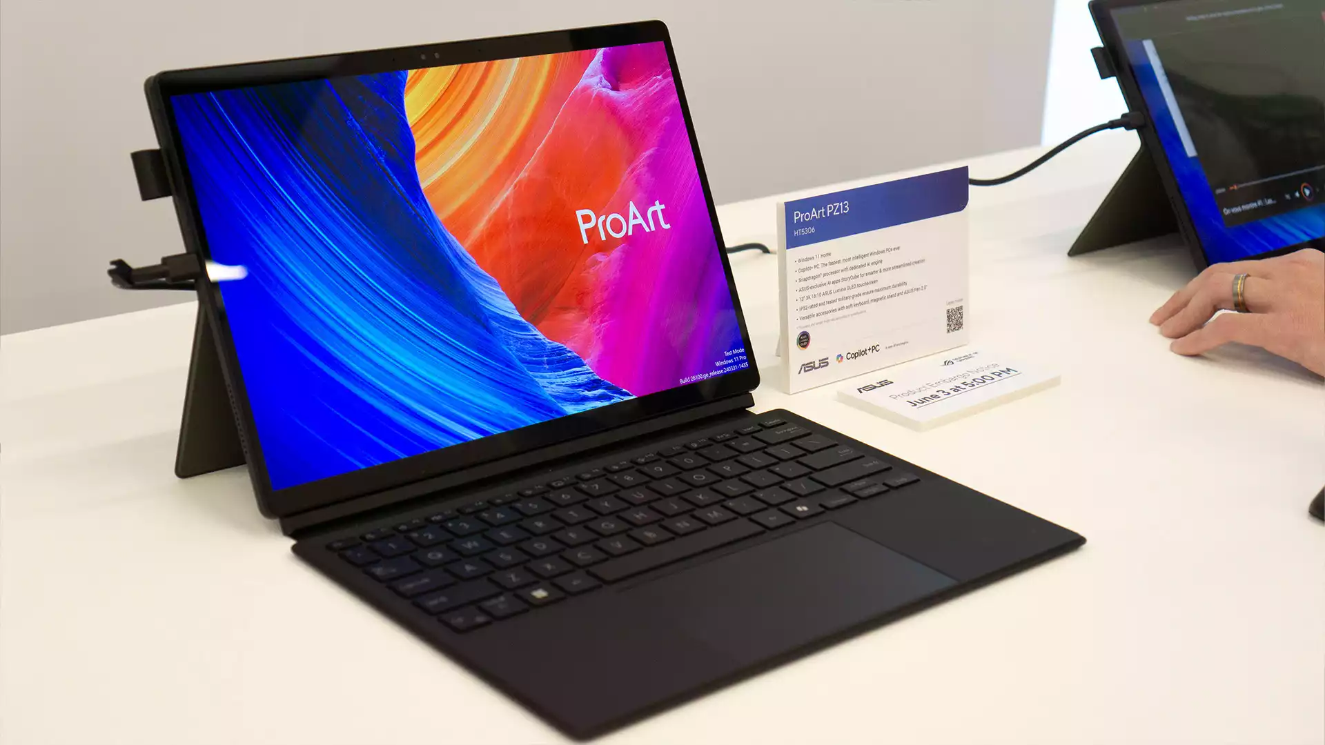 Enfin, il y a l’ASUS ProArt PZ13 2-en-1. Ce modèle est un peu différent, car il fonctionne avec une puce Qualcomm Snapdragon X. La RAM et le stockage pour celui-ci vont jusqu’à 16GB et 1TB respectivement. Comme précédemment, il s’agit d’un écran tactile 16:10 de 13 pouces. De plus, l’appareil lui-même est également doté d’une certification IP52. L’entreprise précise que le support et le clavier, qui se fixent par aimantation, ainsi que le stylet, sont inclus dans la boîte, ce qui est avantageux car ils représentent souvent des extras coûteux.