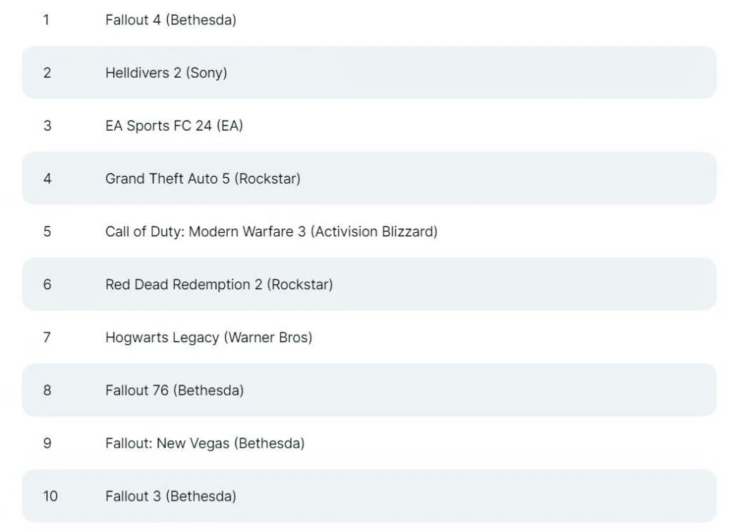 Au sein de ce même classement, Fallout 76 occupe la huitième position, suivi de près par Fallout : New Vegas et Fallout 3. La présence de plusieurs jeux de la même franchise dans les meilleures ventes met en lumière la popularité durable de l’univers Fallout. Chaque titre apporte son propre univers et son intrigue, enrichissant l’expérience globale des joueurs et témoignant de la profondeur narrative et du gameplay captivant de la série.