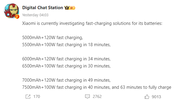 Xiaomi, leader mondial de la technologie des smartphones, présente ses dernières avancées en matière de recharge rapide. Selon DCS, un blogueur tech renommé, Xiaomi a concentré ses recherches sur le développement de batteries à très haute capacité compatibles avec une vitesse de charge ultra-rapide.