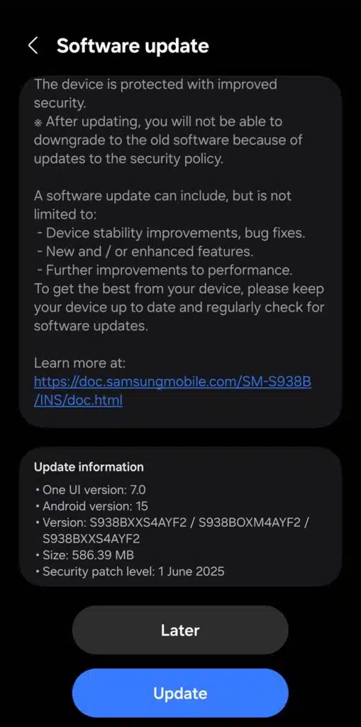 La mise à jour porte la version du firmware S93BXXS4AYF2 pour les utilisateurs en Inde et S93BXXS4AYF1 en Europe. En plus des correctifs de sécurité du mois, cette mise à jour introduit également une modification importante du bootloader, laissant présager l’arrivée imminente de la version Beta 2 de One UI 8.