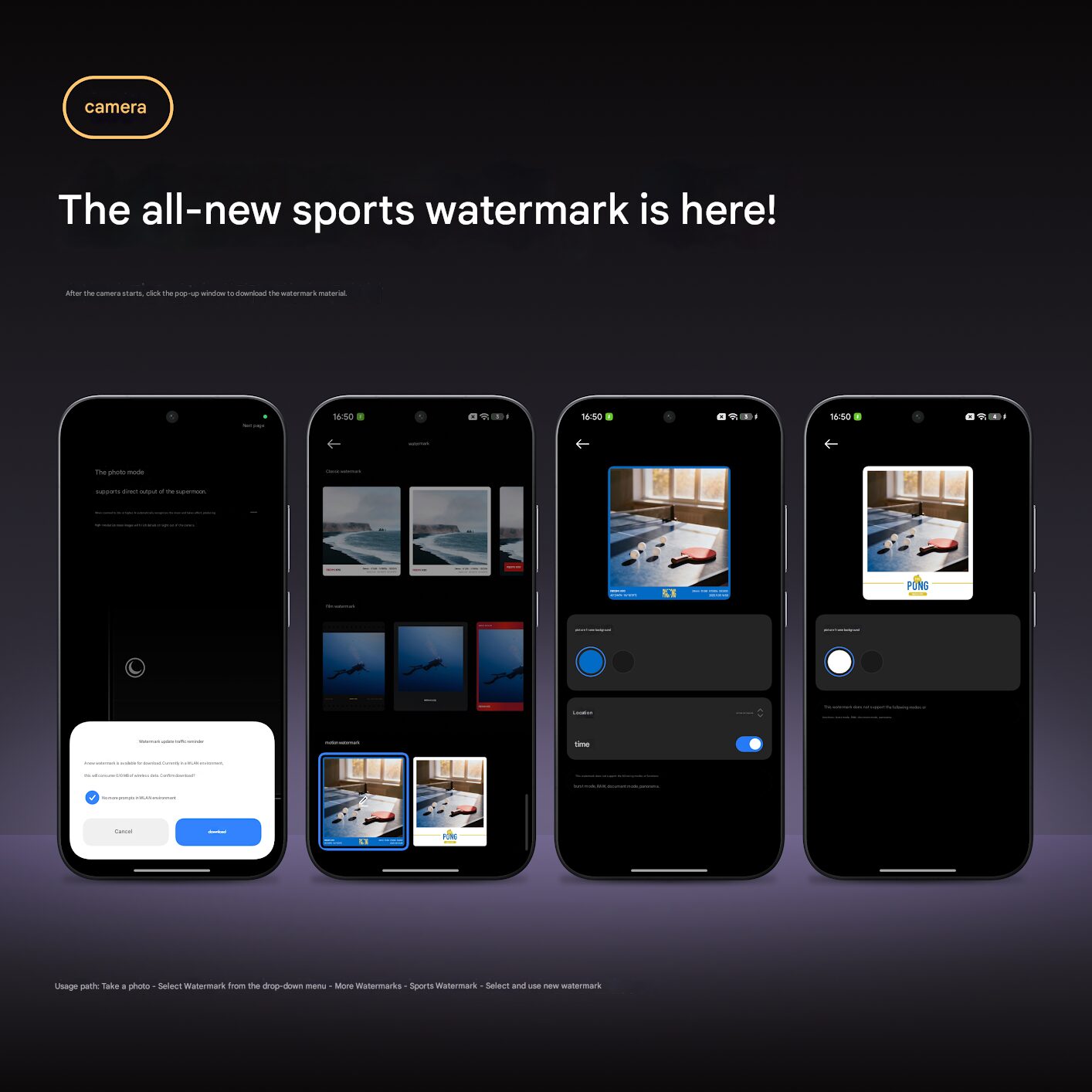 Une fois activé, le filigrane animé est automatiquement appliqué aux photos ou vidéos, avec effets visuels créatifs et superposition de données.