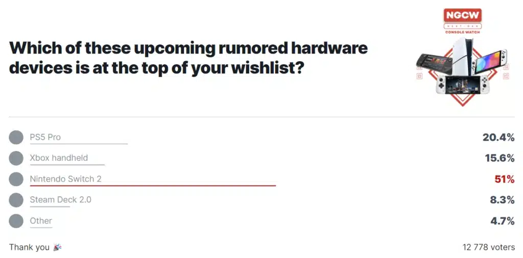 Une enquête menée par le célèbre site de jeux vidéo IGN a révélé que Nintendo Switch 2 domine les attentes des utilisateurs. Le sondage a attiré plus de 12 000 participants, avec 51% d’entre eux exprimant leur impatience pour le lancement de cette console. Elle devance ainsi le PS5 Pro, qui a recueilli 20,4% des voix et est attendue en vente vers la fin de l’année. Par ailleurs, 15,6% des sondés ont montré un intérêt pour une version portable de la Xbox, bien que Microsoft n’ait pas confirmé de projets à ce sujet. La Steam Deck 2 de Valve, bien que moins plébiscitée avec seulement 8,3% des votes, soulève également des discussions, bien qu’une sortie ne soit pas prévue avant fin 2026.