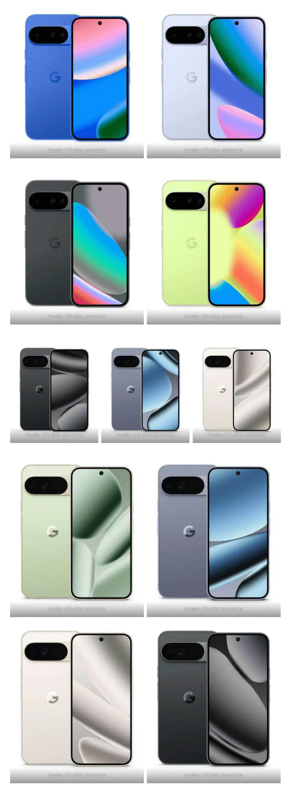 Le Pixel 10 serait proposé en quatre coloris : Obsidian (noir), Frost (gris clair), Lemongrass (jaune) et Indigo (bleu). Le Pixel 10 Pro arriverait en Obsidian, Porcelain (blanc), Moonstone (gris) et éventuellement Jade (vert). Ce dernier ton pourrait être réservé au Pixel 10 Pro XL et au Pixel 10 Pro Fold.