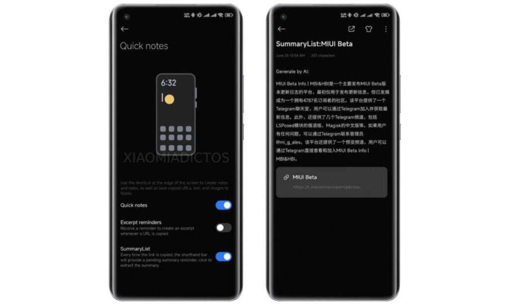 La dernière version Beta de HyperOS inclut une nouveauté notable dans l’application Notes. Avec l’activation des notes rapides, copier un lien déclenche désormais une option pour créer instantanément un résumé succinct de son contenu. Cette fonction sera vraisemblablement un point fort de HyperOS 2.0.