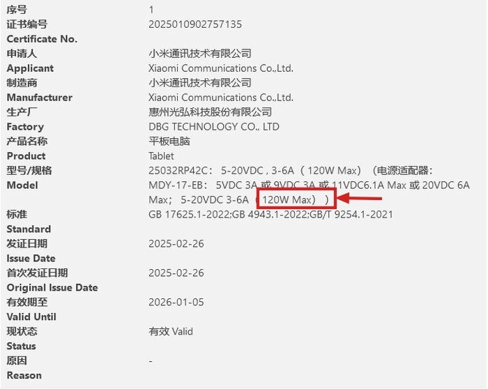 Xiaomi s’apprête à dévoiler une nouvelle tablette haut de gamme, récemment repérée sous le code 25032RP42C dans la certification chinoise 3C. Son principal atout ? Une charge rapide de 120W, une avancée majeure par rapport aux modèles précédents. Elle sera accompagnée du chargeur MDY-17-EB, spécialement conçu pour supporter cette puissance.